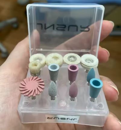Es un kit completo para acabado y pulido dental, diseñado para usarse con contraángulo de baja velocidad (RA).