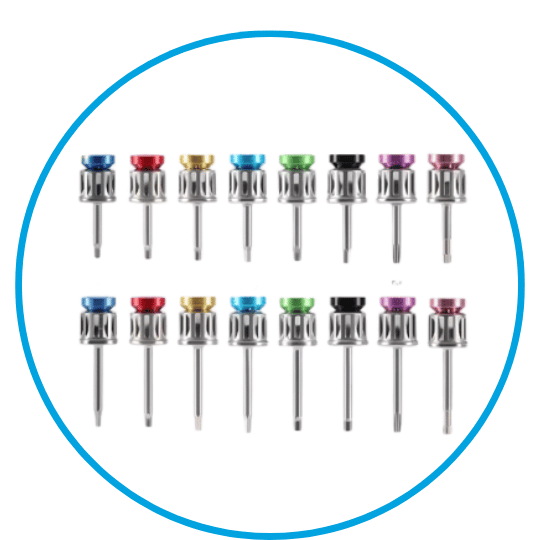 Set completo de 16 puntas (drivers) en versiones largas y cortas, con medidas 1.0, 1.19, 1.2, 1.25, 1.27, 1.4, T-5 y T-6, ofreciendo compatibilidad y versatilidad para diferentes sistemas implantológicos.