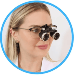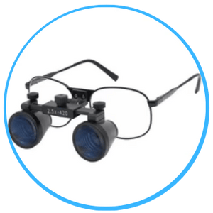 Lentes de vidrio con ampliaciones de 2.5x o 3.5x y distancia focal de 30 a 42 centímetros.